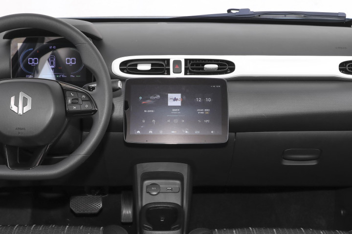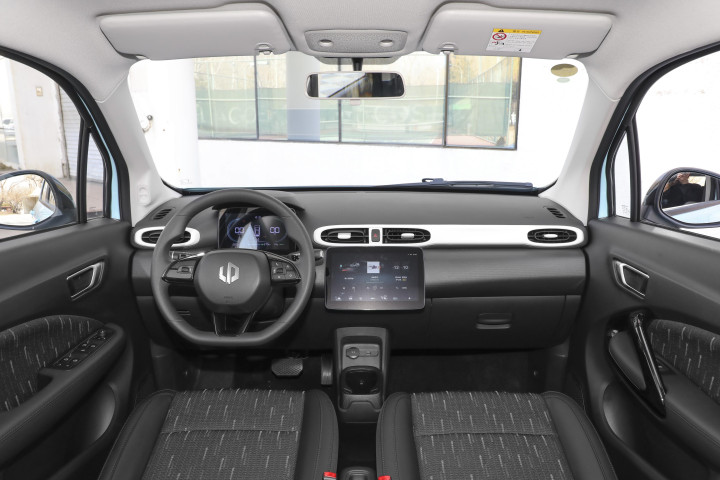 从外观部分进入到车辆的内部,内饰方面两款车型由于是微型车的原因,所以在内饰设计方面还是以简洁化为主,整体的设计风格主要采用的是以实用为主的风格设计。首先是零跑T03,这款车型的内部设计采用的是黑色为主的设计风格,而且内饰中控台布局简单合理,搭配硬塑料的材质,虽然不会显得高档,但是实用性还是不错的,而在配置方面,搭载有8 英寸悬浮式仪表盘以及10.1 英寸的中控屏,在配置方面还是以实用为主,而且在车机系统方面配备的是Leapmotor OS,无论是在功能性方面还是实用性方面确实有着不错的表现,而且搭载的是科大讯飞 3.0 系统语音控制系统,能够轻松且快捷的实现语音交互,带来更加方便的用车体验。